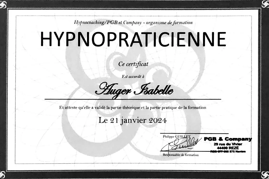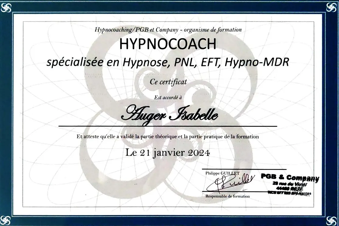 Durant plusieurs années, je me suis formée en Théorie PolyVagale (le nerf vague), en PNL (Programmation neuro-linguistique), hypnose Ericksonienne (enfants, ados, adultes) et en EFT (Technique énergétique de libération émotionnelle) pour lesquelles je suis certifiée notamment « Pleine Confiance » avec Ludovic Leroux, « Hypnocoaching » avec Philippe Guillet et Hypnose enfants/ados, accompagnement parental avec Isabelle Ablain.